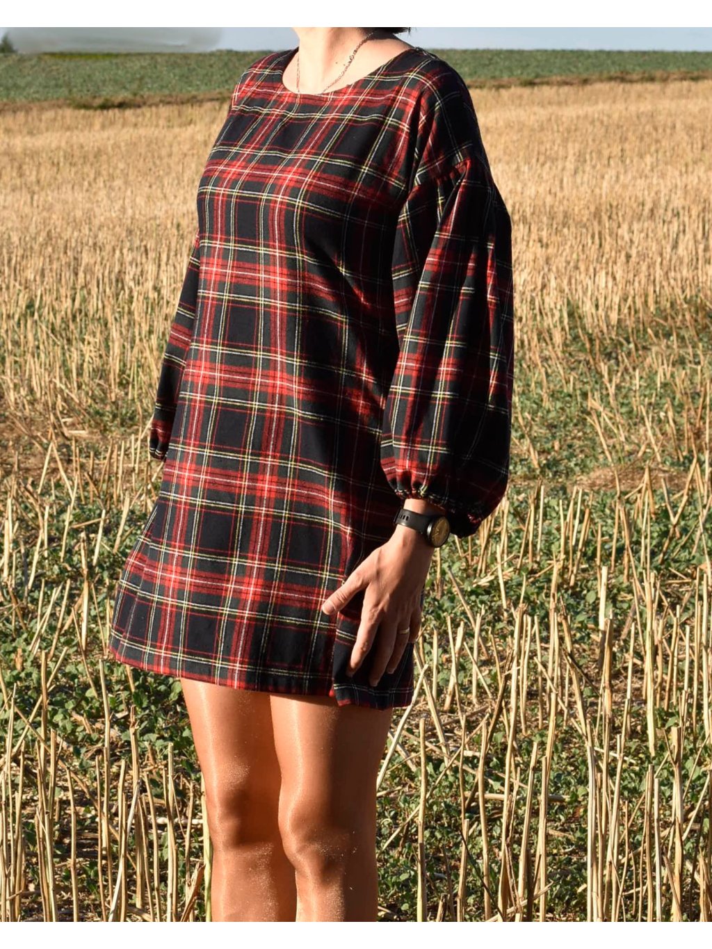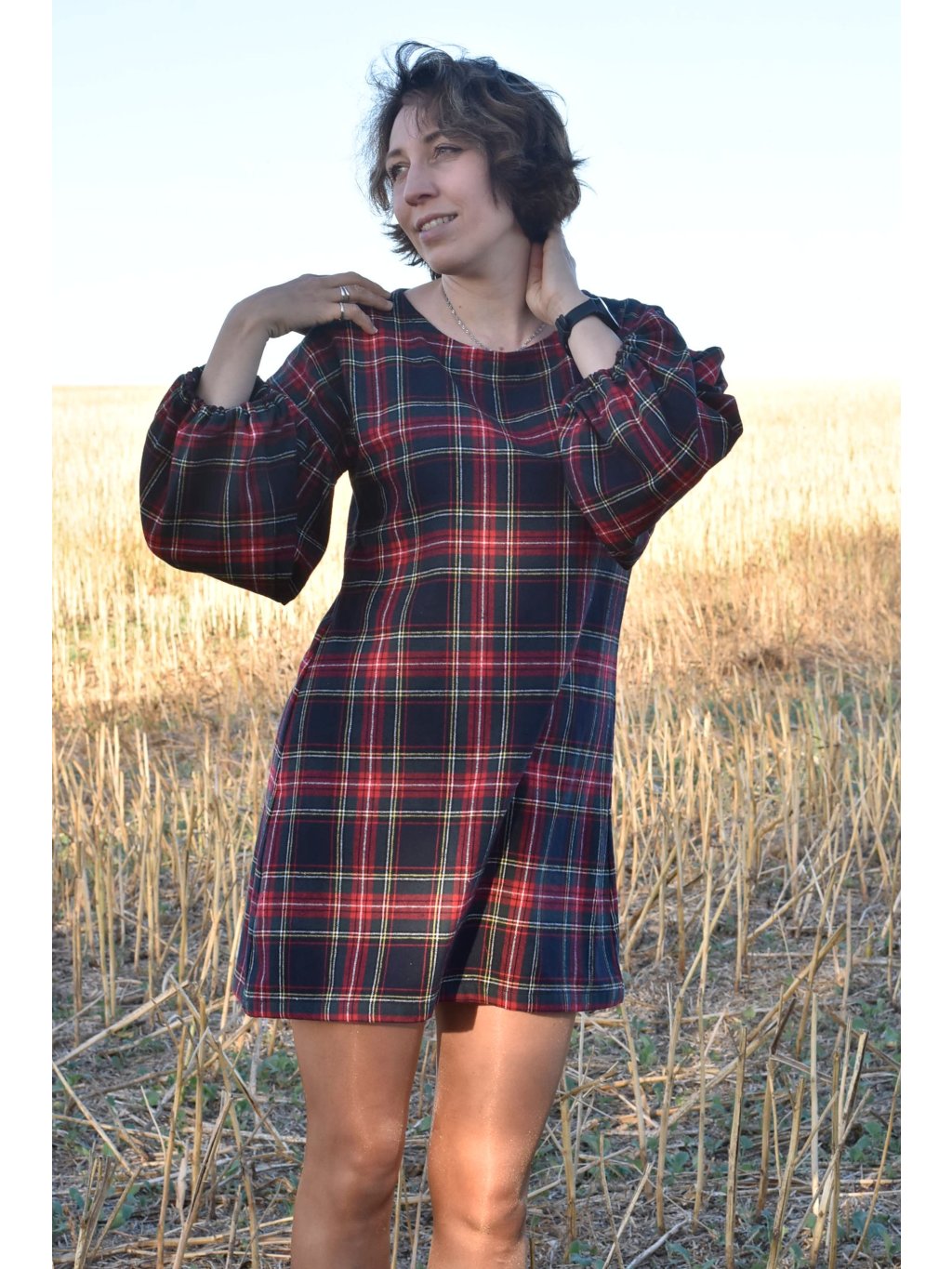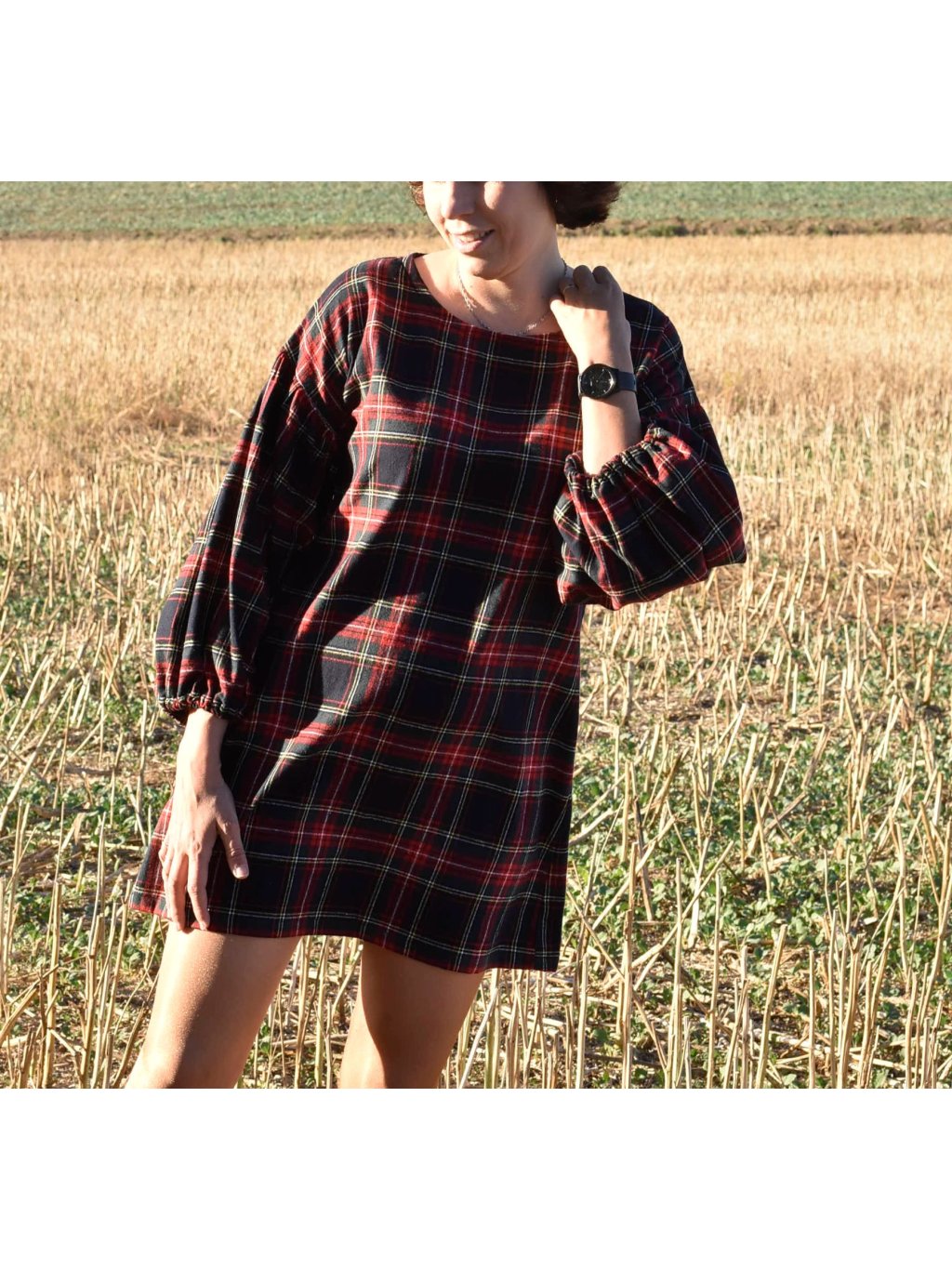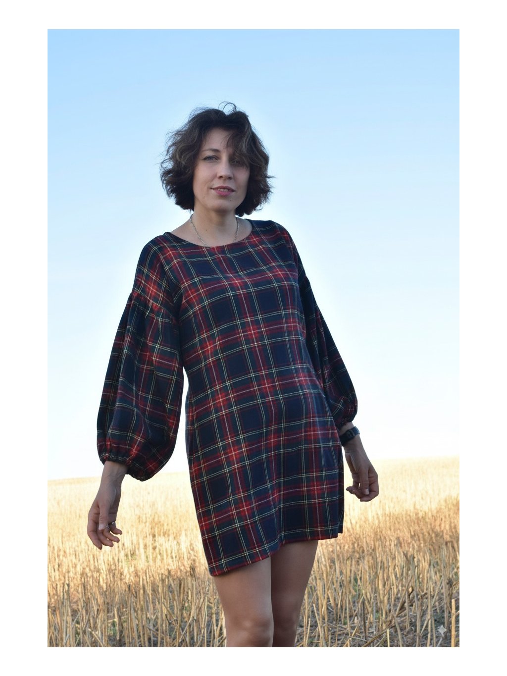 jemné mini flanelové šaty s maxi balónovými rukávy jsou ideální na podzimní/jarní období