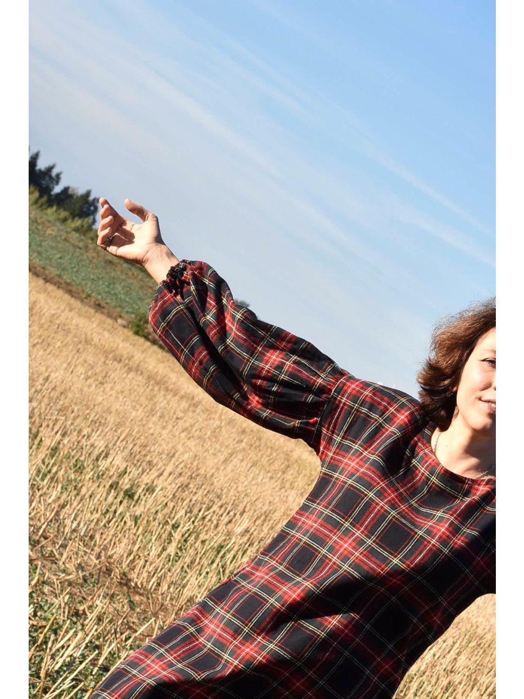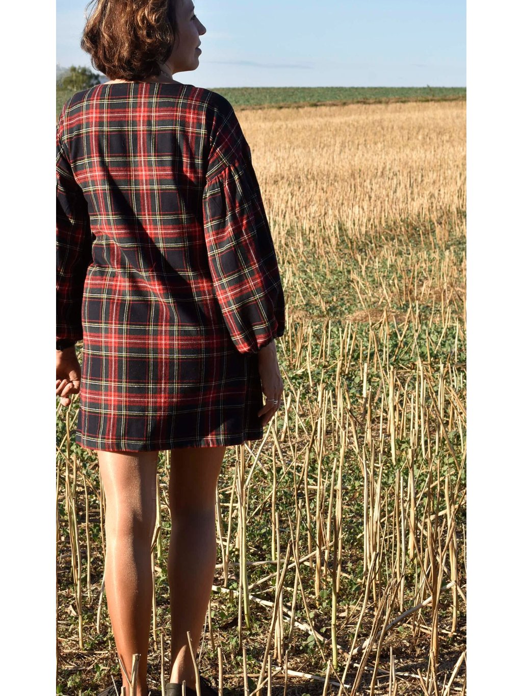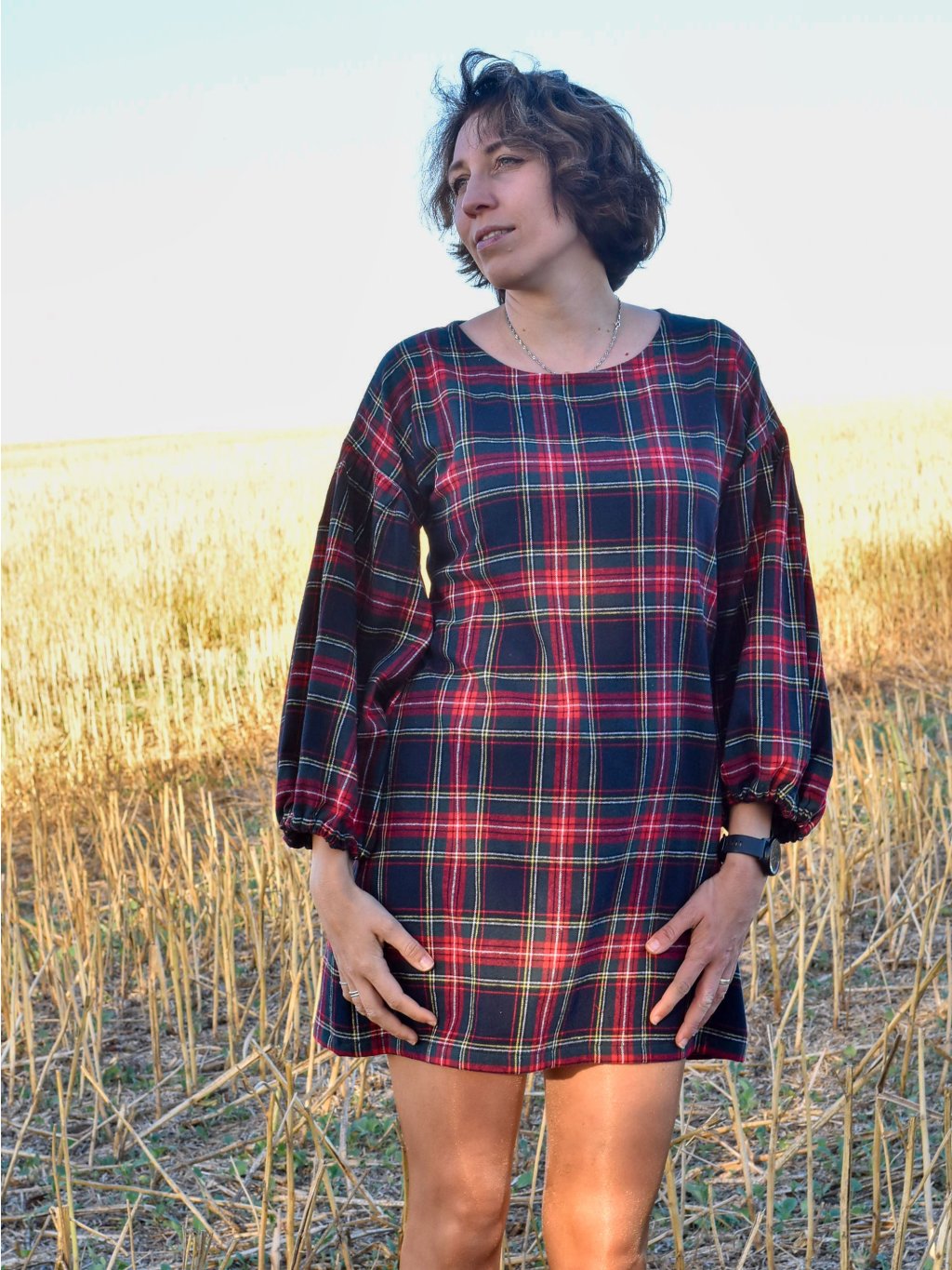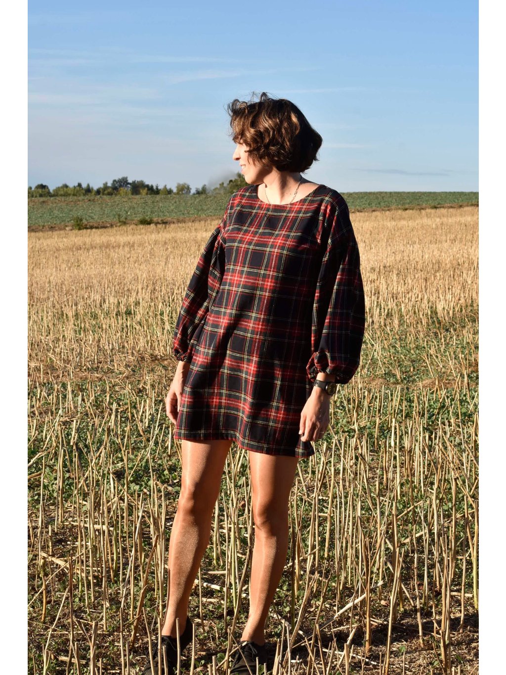 jemné mini flanelové šaty s maxi balónovými rukávy jsou ideální na podzimní/jarní období